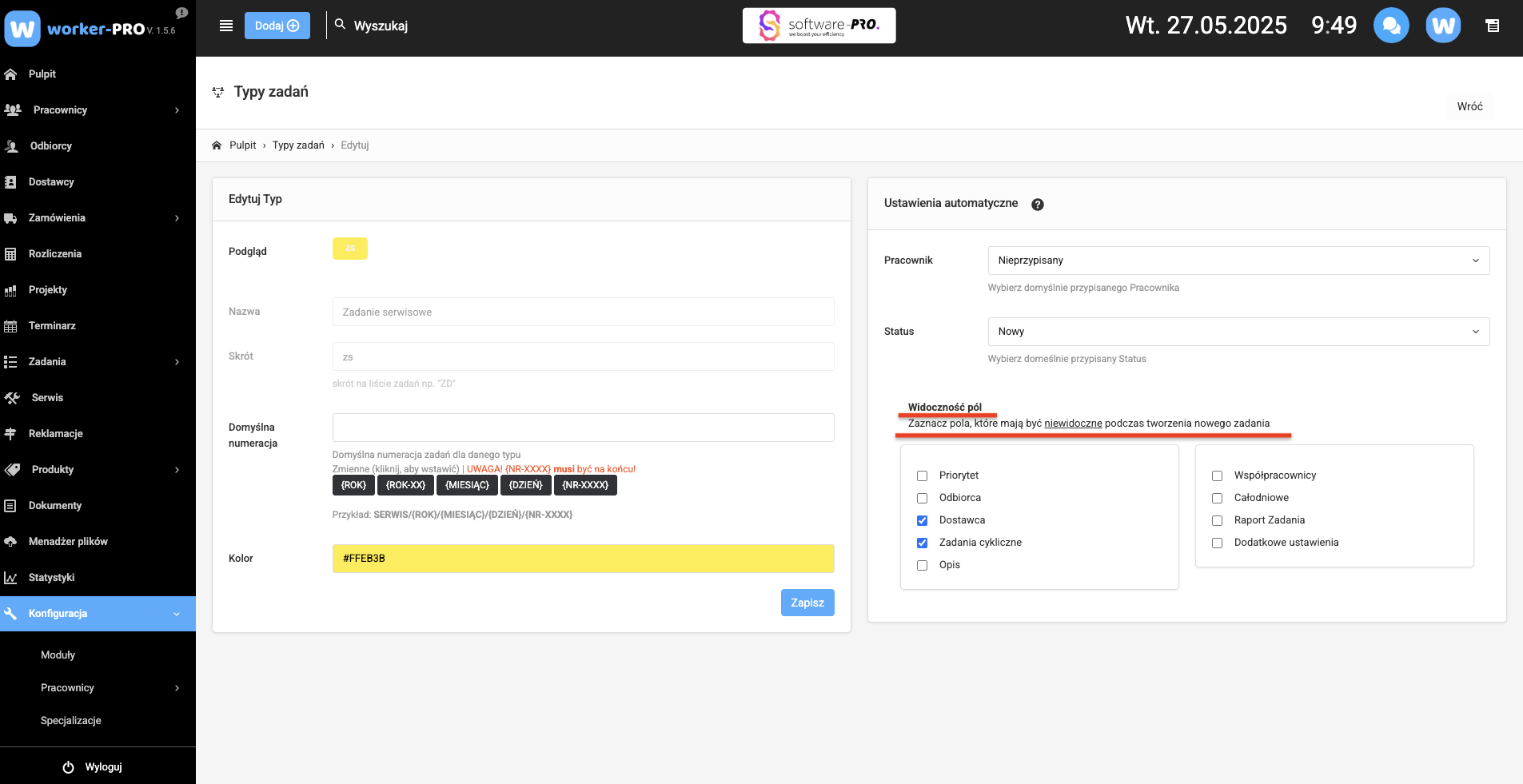– definiowanie typów zadań i ich zakresów – możliwość tworzenia predefiniowanych typów (np. serwis, konsultacja, przegląd techniczny), które ułatwiają kategoryzację i przypisywanie oraz określanie zakresu danego typu zadnia np. zadanie serwisowe może mieć inny zakres kreatora zadania od zadania biurowego;