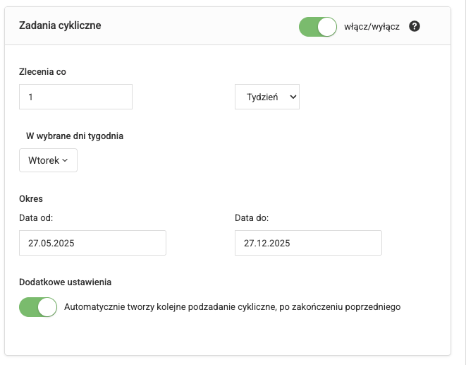 – zadania cykliczne – automatyczne tworzenie zadań np. co tydzień, co miesiąc czy w konkretny dzień roku. Doskonałe dla usług abonamentowych, przeglądów, raportów.