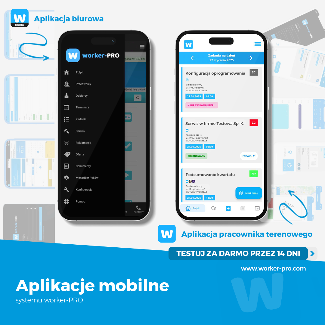 worker-PRO został zaprojektowany z myślą o firmach, które działają zarówno stacjonarnie, jak i w terenie. System oferuje dwie dedykowane aplikacje mobilne: