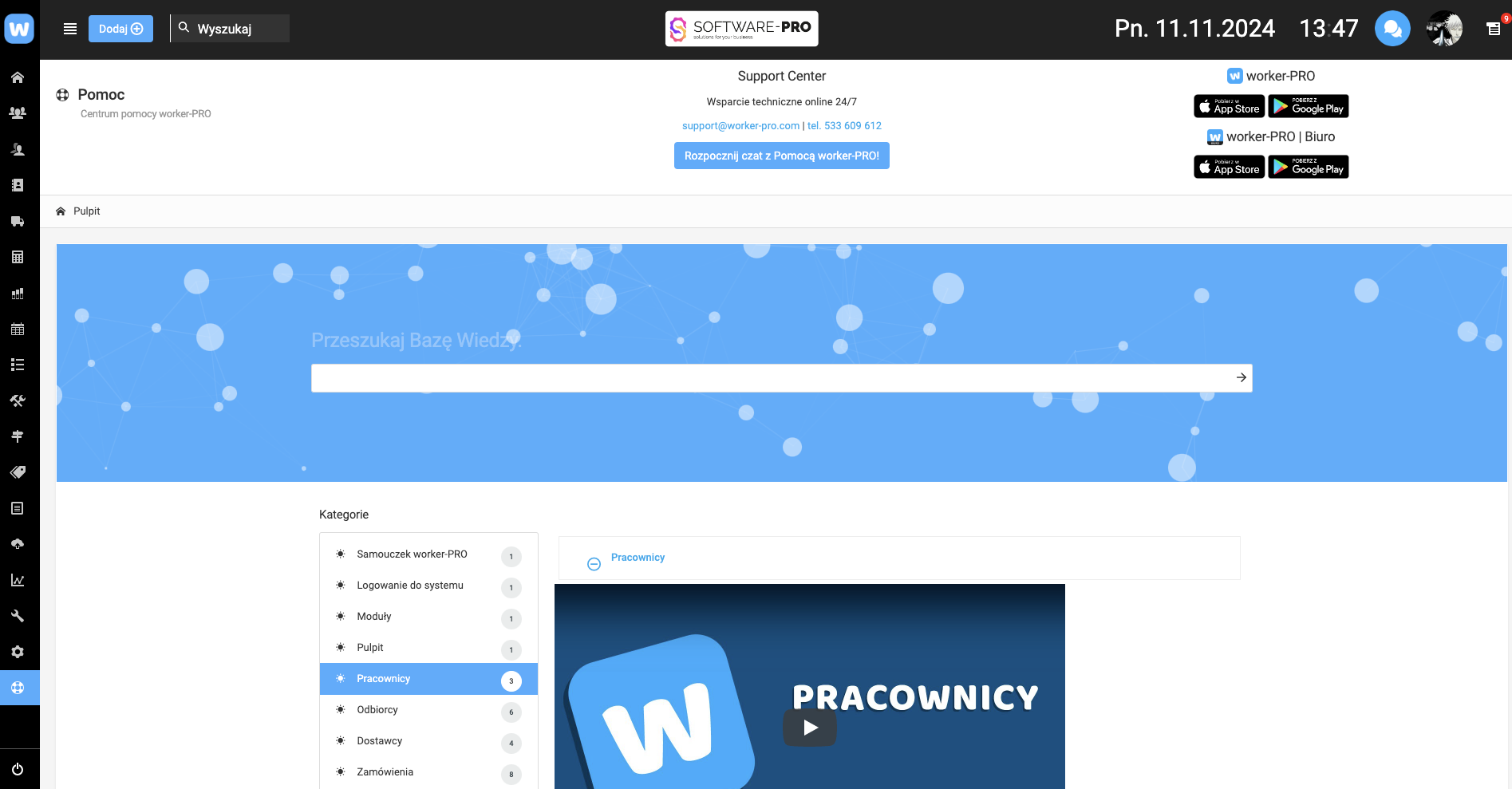 W każdym systemie worker-PRO znajduje się moduł pomocy, w którym mamy dane kontaktowe do działu supportu, jak i zbiór filmów szkoleniowych z funkcjonalności poszczególnych modułów. |