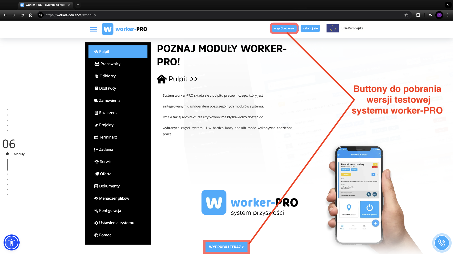 Pierwsza czynnością do rozpoczęcia testów jest oczywiście postawienie wersji testowej systemu worker-PRO. W tym celu trzeba wejść na stronę www.worker-pro.com i kliknąć w button "wypróbuj teraz" , który znajduje się na belce górnej strony www. lub po przesunięciu strony pojawi się na dolnej krawędzi okna.
