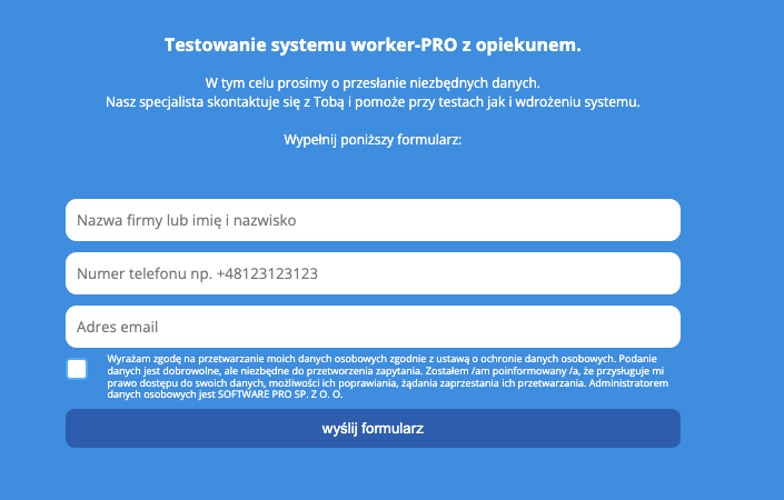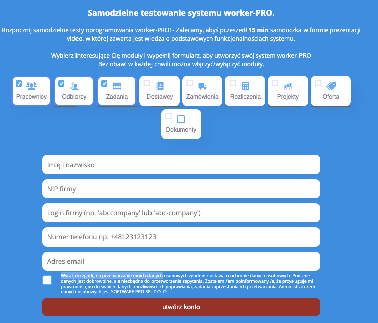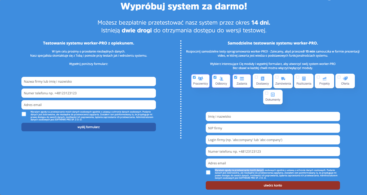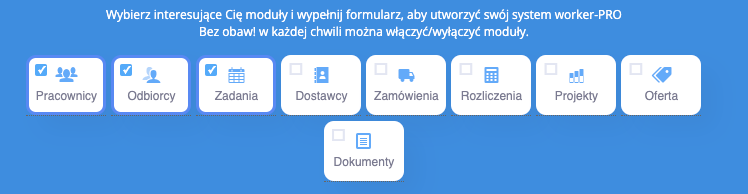 Wybierz interesujące Cię moduły i wypełnij formularz, aby utworzyć swój system worker-PRO.