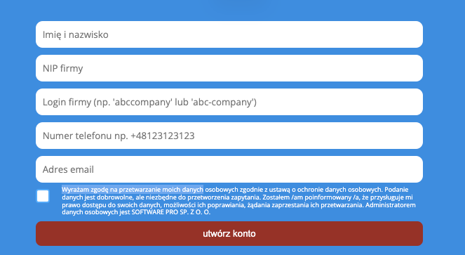login firmy: zdefiniowany w formularzu (np. firmax)