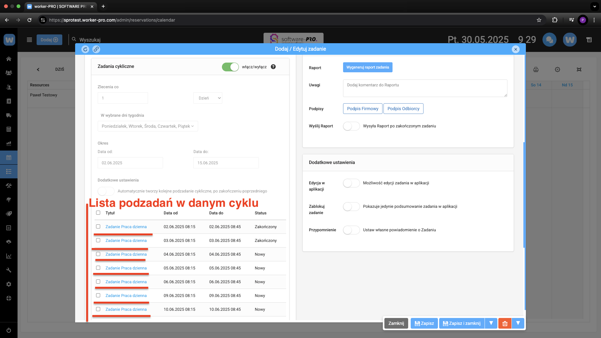 Screen – Zadanie cykliczne + lista podzadań cyklicznych w kreatorze zadania cyklicznego.